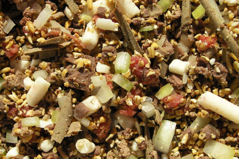 3、煮込んだレバーと心臓は、余分な脂肪や血管をきれいに取り除きます。綺麗になった内臓は細かくみじん切りにしておきます。ポイント:フードプロセッサーでみじん切りにすると楽です。